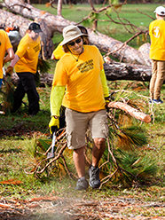 Med motorsågar i hand gick VM:ar genom staden och högg isär rasade träd. Andra ordnade ett Förnödenhetscenter där de delade ut vatten, hygienpaket och babyförnödenheter.